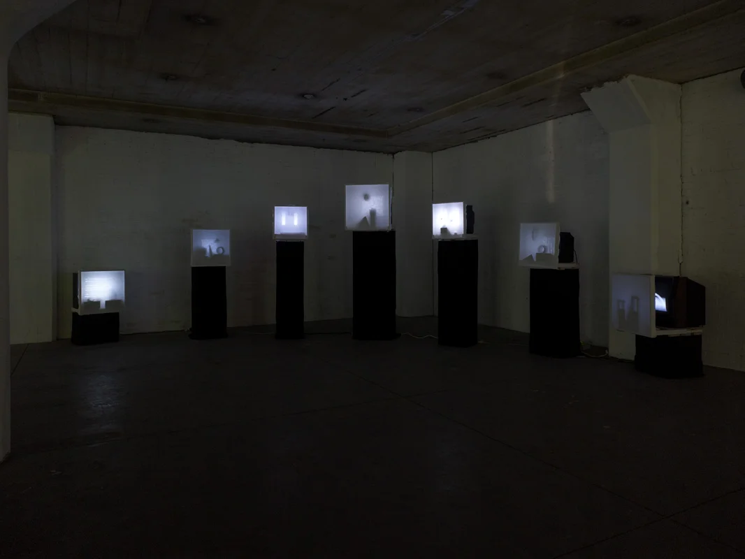 The installation 'shadow, aspect, ratio' re-imagines TVs to be less a terminal and more an origin to create a relationship between light source, object and projected surface. TVs, driven by small micro-controllers, cast evolving patterns of light onto an array of inanimate objects. These objects in-turn, cast their animated shadows onto small screens illuminating the contrasts between light and dark, angle and distance, facts and fictions inspired by my own fascination with the setting sun, the rising moon, early astronomy and technologies both new and obsolete.